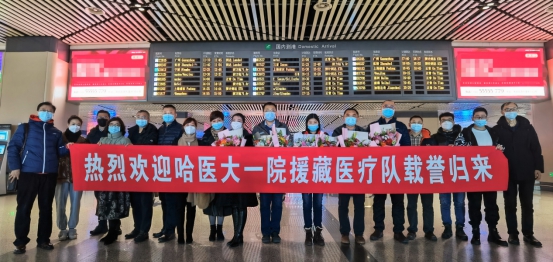 11月11日中午,哈医大一院第七批援藏专家圆满完成任务胜利返哈,援藏专家家属和同事携带鲜花一同前往哈尔滨国际机场迎接周昊昕、王东春、芦曦、张金玲、胡婕5位专家凯旋。