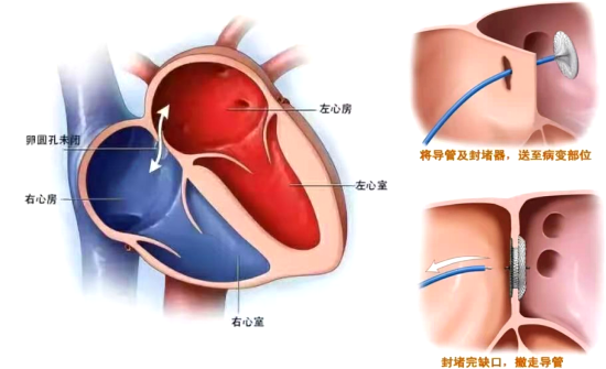 涂应锋表示,经皮介入卵圆孔未闭封堵术具有安全、有效、创伤小的优点。“封堵器就像一柄伞一样,当导管通过卵圆孔未闭处时,通过释放,把“伞”紧紧卡在卵圆孔未闭处,进而实现了卵圆孔未闭封堵。”