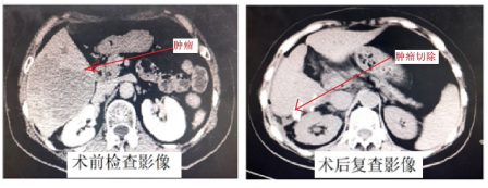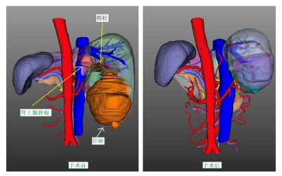 三维可视化评估技术对比术前、术后影像学变化,提示肿瘤及癌栓彻底切除