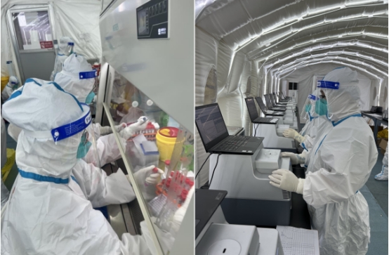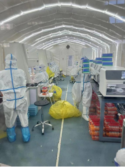 此次哈医大二院支援哈尔滨市移动实验室核酸检测队由24名检验人员、33名护理人员、1名医务科行政人员和1名水电科人员组成。核酸检测队队员们是疫情防控战线上的侦查兵,距离病毒最近,穿戴厚厚的防护服,24小时轮转,禁水禁食成为习惯,昼夜颠倒,分秒必争。全队累计完成新冠病毒核酸检测量178000管,3560000人次。单日完成最大新冠核酸检测量17000管,340000人次,零差错精准完成标本检测工作,圆满完成使命。