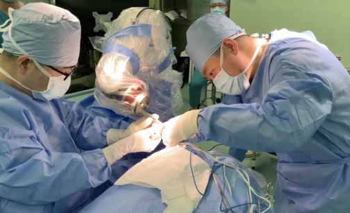 郭冕教授(右)带领团队为帕金森患者进行Sino机器人辅助下DBS手术