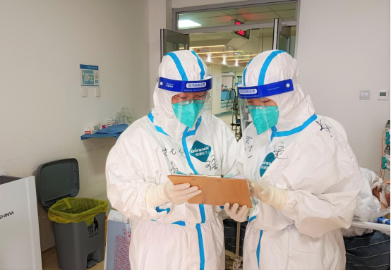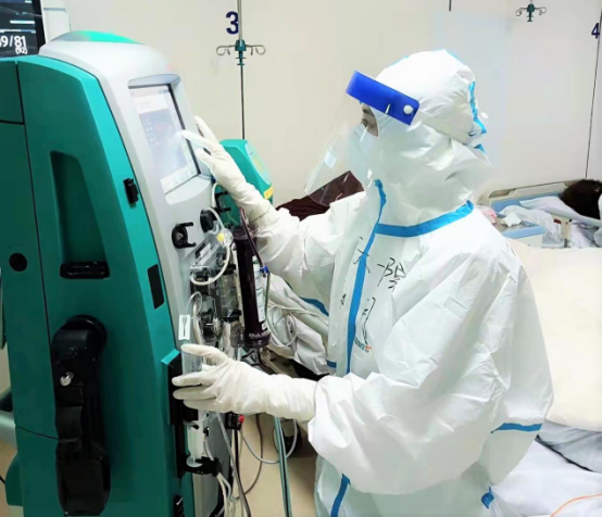 为了保证治疗质量,每名队员都处于高强度、超负荷状态,竭尽全力为患者提供规范化治疗。遇到为患者气管插管、支气管肺泡灌洗等高风险操作时,队员们总是主动冲锋在前,每天多次进行呼吸力学监测、肺复张、滴定最佳呼气末正压、调整机械通气参数、开展俯卧位通气、连续性肾脏替代治疗等救治手段,在医疗队员们的努力下,多数机械通气的危重型患者成功脱机并治愈出院。