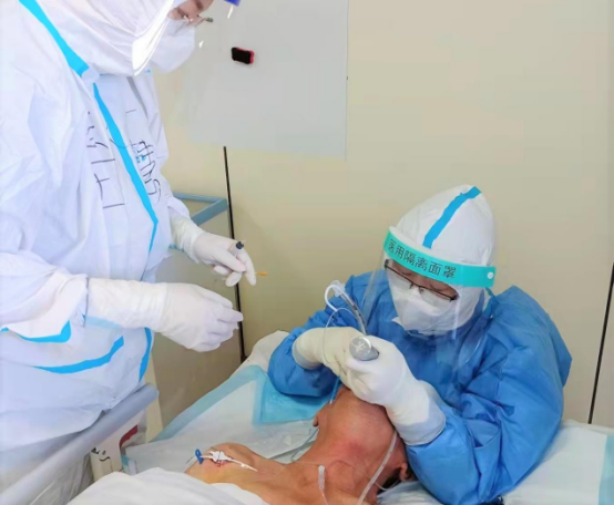 与时间赛跑、与病毒较量,完成支援吉林医疗队首例应用ECMO救治危重型病例,共计完成ECMO救治6例、有创心功能监测4例,有创血压监测50余例、有创机械通气20余例、无创机械通气20 余例、经鼻高流量氧疗近40例、连续性血液净化40余次、支气管镜治疗50余次、中心静脉置管40余例、重症超声150余次、气管切开3例,为患者赢得更多救治时间。