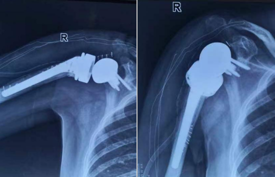 王文波对李女士右肩关节进行彻底清创手术,术后患者的感染很快得到治愈,但右臂功能严重受限。王文波团队择期为患者行二期反向全肩关节置换术,最大程度保留肩关节活动度,恢复李女士的肩关节活动度及稳定性。术后,经过康复训练,李女士已能自主完成洗脸洗头、刷牙喝水等基本的日常活动。