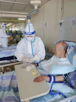支援重症一线,不仅仅是技术上的支援,更是精神上的慰藉。江雪婷还清楚地记得,有一次照顾一位89岁的爷爷,当她给爷爷喂早饭时,爷爷哽咽地哭了,雪婷以为是自己哪里做得不好,让爷爷难受了,忙连连道歉,可后来和爷爷聊天才知道,是因为爷爷一直住在养老院,好久没有人关怀呵护他了,雪婷给爷爷喂饭时,让他又感受到了家人般的温暖。听了爷爷的话,雪婷眼里泛起了泪花,之后的每一天,她都会陪爷爷说说话,“希望您早日康复,下一个班时,我希望看到您精神矍铄的样子。”“希望您能早点出院,我也能脱去厚重的防护服,在春暖花开的吉林街头,我们能互相握手,共话家常!”每当听到雪婷的祝福,爷爷都会点头微笑。江雪婷说:“重症病房的患者由于思念亲人,担忧病情,心理压力很大。所以我们在为患者精心护理的同时,也要多进行心理上的疏导,让他们感受到希望和力量。”