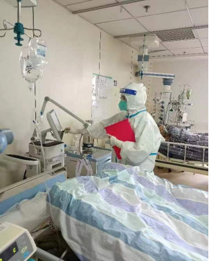初怡君不但专研业务,而且技术也过硬。还记得有一次,科室接到“普通病房有患者进食过程中突然出现窒息,请求抢救支援”的紧急呼叫,初怡君第一时间收整抢救用品,奔赴普通病房支援抢救。重症病房在2号楼,求助的普通病房在1号楼,由于疫情管控,两个楼并不相通,春寒料峭,她也顾不上多想,就跑出了楼外,防护服里面只有单薄的短袖刷手服,冷风一吹,她不禁打了个冷颤,一路小跑,不透气的防护服里捂出了汗,冰凉的防护服被汗水贴在身上,难受极了,但是时间就是生命,初怡君脚下一刻不停,飞奔到了病房。到了病房患者已经没有了自主呼吸,然而初怡君并没有放弃,决定为患者进行气管插管开放气道。没有护目镜,只有一层面屏,没有可视喉镜,只有简易喉镜,但这些困难都不能阻挡她抢救患者的脚步,清理气道,开放气道,气管插管,球囊通气,转运回icu……熟练的操作,一气呵成。病床很重,而且有点故障,转运过程非常费力,回到病区交接完毕,大家才发现每个人的鞋套都被磨破,每个人的腰、腿、胳膊由于用力过猛,都在隐隐作痛。下了班换衣服时,初怡君才发现,自己的膝盖青肿,小腿磕破了皮儿,腰上也是一片青紫,虽然工作辛苦,但她没有怨言,她深知,这是她热爱的工作,也是她要实现治病救人的初衷。