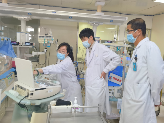5月1日上午,在新生儿科病房内,三个科室医生就位,护士们井然有序地为患儿做术前准备,大家的注意力不敢有一丝懈怠。于有与新生儿科医生于嘉一起商定术后的治疗方案,超声科医生姜海宇、郭彬彬也在认真准备术中需用的器械。大家准备就绪,护士为患儿注射了镇静剂,姜海宇全神贯注看着彩超屏幕,因为孩子比较小,所以一点点的偏差都有可能导致手术失败。