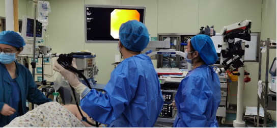 5月1日上午9时,在送入哈医大一院8个小时后,肿瘤腔镜内科李正天副教授、消化内科尚国印医生及麻醉科、消化内镜室护士、手术室护士组成的多学科治疗团队,在哈医大一院中心手术室内,再次为李女士尝试将异物取出。