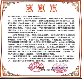 2021年9月27日,出发支援木兰县的20人核酸采集队伍在进行了3天的支援任务后,又接到了继续支援巴彦县的通知,核酸采集团队15分钟内整装待发,开启了为期7天的支援任务。在支援任务中,他们不分昼夜,采集量近八万人次。木兰县为参与支援核酸采集任务的每位护理人员颁发了荣誉证书,并发来感谢信。
