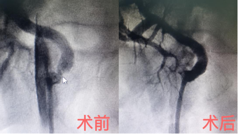 由于患者进行过肾移植手术,狭窄的位置恰好是移植肾血管近吻合口,给支架植入手术造成了一定困难。哈医大二院心血管病医院院长、心内科主任于波教授带领团队,凭借丰富的经验和熟练的操作,成功为移植肾动脉血管进行了一个支架植入。