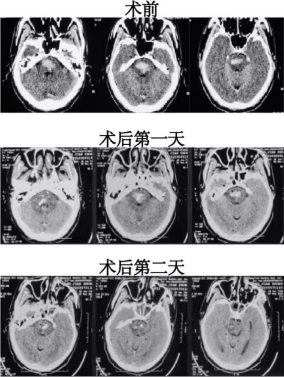 Sino机器人辅助下脑干出血穿刺引流术前和术后CT