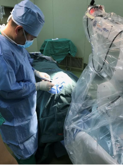 郭冕教授表示,脑干是脑组织的一部分,脑干是由中脑、脑桥、延髓构成,解剖位置狭窄,因此在出血时直接损伤脑干,引起呼吸中枢、循环中枢,脑干网状上行激动系统等重要部位的损伤,脑干出血是脑出血中最严重的一种,约占脑内出血的10%,相对于其它部位的脑出血,脑干出血病人症状重、进展快、死亡率高,一般而言,出血量达到5毫升就非常危险了。赵先生的手术迫在眉睫,只有尽快清除脑内血肿,才能挽救生命并顺利进行康复。然而,他的出血部位在脑干深处,这里结构精密复杂,加上血肿量大,开颅手术容易出现严重的二次损伤。最后,决定使用Sino机器人辅助血肿穿刺引流术治疗脑干出血。