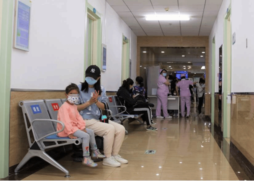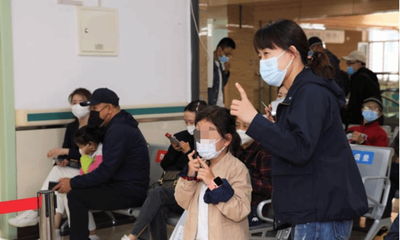 小朋友在家人的陪同下在诊室外有序等待就诊