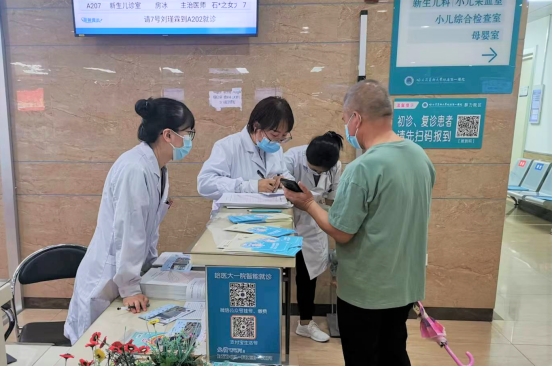 由于很多市民都是家里的老人领着孩子参加义诊,群力院区的医护人员耐心的为老人和孩子们填写信息,帮助市民参加义诊。