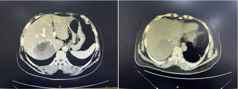 ▲图2术前、术后复查CT对比提示肝脏恢复良好