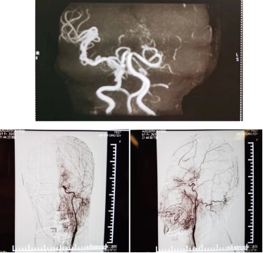 检查显示左侧颈内动脉和右侧大脑前动脉闭塞
