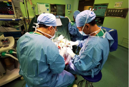 哈医大二院神经外科三病房(脑血管病外科治疗中心)王洪军主任医师(左)带领团队手术