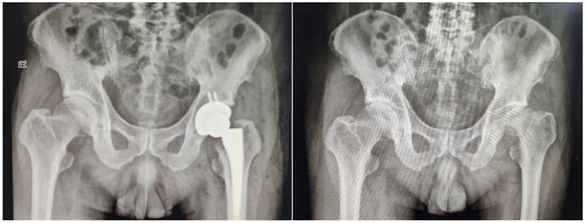 67岁的闫大爷,半年前因车祸外伤导致股骨头骨折并行保守治疗,一月前复查发现股骨头明显塌陷,疼痛症状也日益加重,由于闫大爷酷爱运动,对于术后关节活动度要求很高,因此对于手术治疗十分畏惧,担心无法恢复到良好的效果。在哈医大一院公众号得知群力骨科一病房可以通过微创的方式完成髋关节置换,遂找到王文波教授求诊。