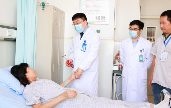 出院前,闫女士紧紧握住谢宝栋教授的手感谢他救了自己的生命