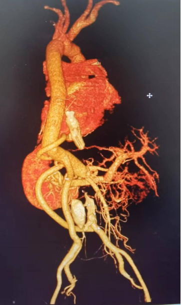 患者术后胸腹主动脉CTA复查结果示重建血管形态良好、各分支重建满意