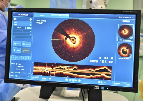 于波表示,此次手术采用的升级创新型OCT主要有三大突出特点,第一点是超长回撤,既往无法通过一次回撤看清整个血管全貌,此次新型导管在2.5秒内即可完成90mm血管回撤,轻松应对超长病变,有效减少回撤次数,提高手术效率,同时也减少了造影剂的用量,更大程度保证患者的安全;第二点是在实际应用中发现,由于该系统采用了独特的转码专利技术,无论是轴向扫描速度,还是光学灵敏度,都达到行业领先水平,成像更为清晰,实际临床使用中更易辨认病变信息;第三点是成像稳定,由于在导管上运用了“光胶囊”专利技术,使导管更容易推送至病变处,成像更加稳定。