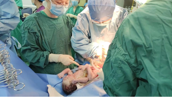 3月6日13时,产科、新生儿科、麻醉科、输血科、超声科、手术室团队、儿外科人员悉数到位,所有术中器材、新生儿保温箱也提前准备完毕。产科黄明莉主任、袁晶副主任一起带领产科团队娴熟地操刀手术。