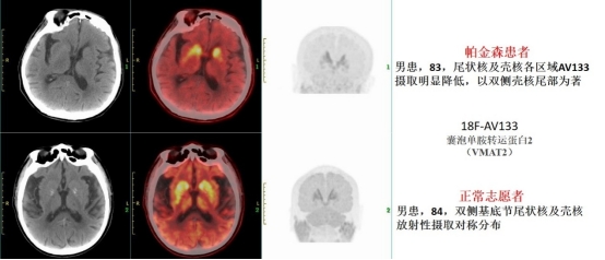 分子显像是研究PD发病机制的重要工具。核素18F合成产率高、物理半衰期长,哈医大肿瘤医院PET/CT-MRI中心具备稳定合成18F-AV133的能力,在省内率先利用18F-AV133 PET/CT无创、靶向评估囊泡单胺转运蛋白2(VMAT2)浓度,客观评估黑质——纹状体通路多巴胺能神经元突触前膜情况。不仅可对PD进行早期诊断、病情监测,还可用于PD的鉴别诊断(特发性震颤、肌张力障碍性震颤、药物源性帕金森综合征、心因性帕金森综合征和血管性帕金森综合征等,在临床上与PD有诸多相似之处),达到早发现、早诊断、早治疗,延缓疾病进展,改善患者的生活质量。