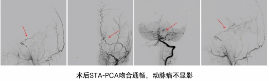 考虑患儿右侧后交通动脉代偿供血良好,如果采用左侧STA-PCA bypass 继续代偿后循环血供,会大大降低患儿动脉瘤弹簧圈栓塞术后出现严重神经功能障碍的风险。但STA-PCA bypass手术难度较高,黑龙江省内暂无相关实施经验,在与郑秉杰副主任反复周密的术前讨论后,史怀璋教授决定为患儿实施首例STA-PCA bypass及动脉瘤弹簧圈栓塞术。
