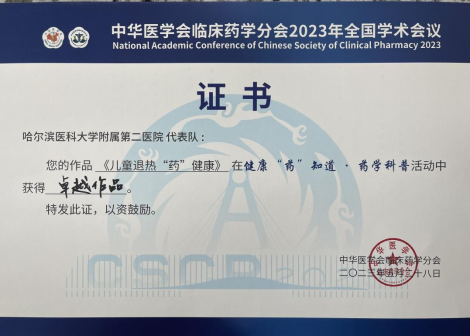 中华医学会临床药学分会2023年药师科普大赛受到全国药师的广泛关注,海选仅3天的时间就有634万余人次访问和249余万人次投票。哈医大二院药学部创作的《儿童退热“药”健康》以选题角度新颖、内容实用、表述生动等特点得到了公众认可,经过读者投票和专家评审层层优选后,成功晋级全国总决赛。