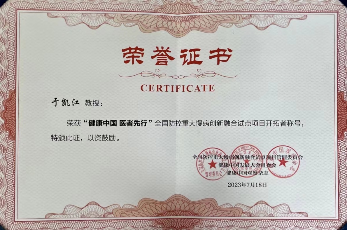 近日,2023健康中国发展大会全国防控重大慢病创新融合试点项目推进大会在北京举行。哈尔滨医科大学附属第一医院获评首批全国防控重大慢病创新融合试点项目单位。于凯江教授获评“健康中国 医者先行”全国防控重大慢病创新融合试点项目开拓者荣誉称号。