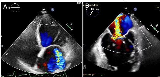 术前经胸和食道超声结果。左图:经胸超声提示心房心室扩大,二尖瓣重度反流;右图:食道超声提示二尖瓣重度反流(彩色血流)。
