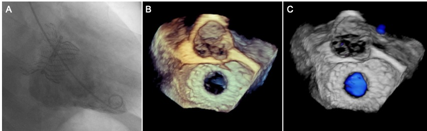 术后即刻造影和超声结果。左图:造影结果提示瓣膜工作良好,二尖瓣无反流;中图和右图:三维超声提示瓣膜工作良好,二尖瓣无反流。