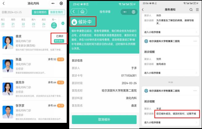 当专家号满时,患者可以通过系统登记信息进行候补挂号,待有退号可自动按候补顺序占号,并给患者发送消息提醒。该机制能够有效减轻患者等号负担,当医生满号后,患者可不必随时查看是否有退号,提交挂号候补信息后,等待候补挂号成功的消息提醒即可。