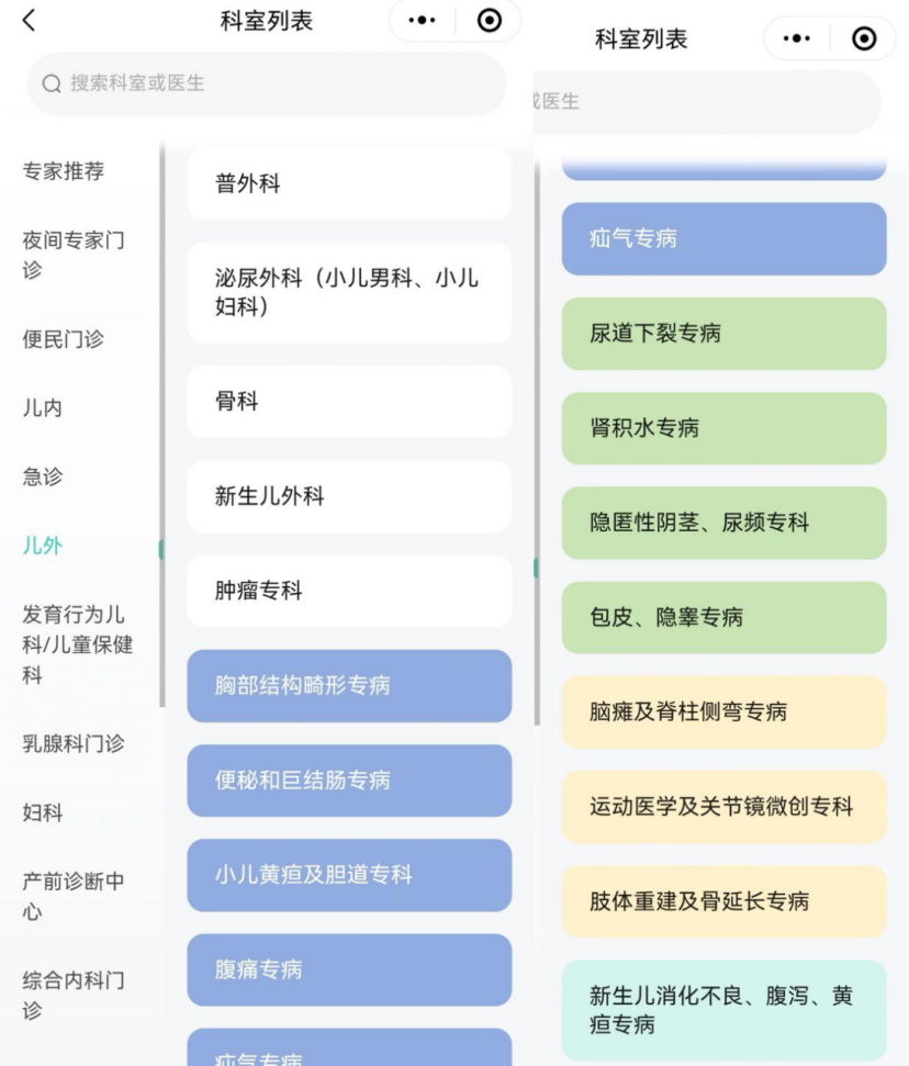 为充分发挥专科专业优势,满足患儿专病个体化就医,进一步提升诊疗服务,儿外科设立了19个专病门诊,对症挂号、按病索医。专病门诊以患儿常见疾病、症状命名,简单、精确,不仅方便患儿家长在就诊前明确挂号,快速找到对应专病门诊,有效节约就诊时间,还能方便患儿家属在就医过程中“匹配”对该类特定疾病诊疗经验更加丰富、诊治能力更加突出的医生,享受到更加规范化、精准化、个体化的诊疗服务。