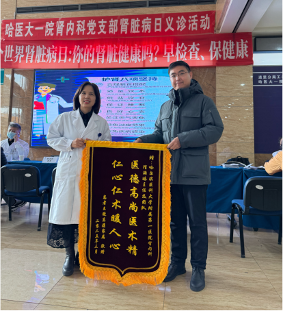 活动现场出现感人场景,患者家属专程向隋满姝团队赠送"医德高尚医术精,仁心仁术暖人心"锦旗,彰显肾内科医患的和谐关系。