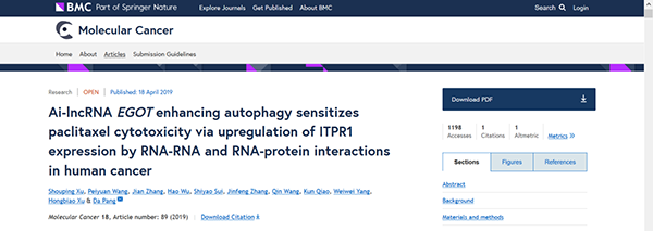 哈医大肿瘤医院庞达教授研究团队,继在国际顶级肿瘤学杂志《Molecular Cancer》(SCI影响因子10.679)、《Autophagy》(SCI影响因子11.059)发表乳腺癌致病驱动基因关键分子机制论文后,另一个研究论文《Ai-lncRNA EGOT enhancing autophagy sensitizes paclitaxel cytotoxicity via upregulation of ITPR1 expression by RNA-RNA and RNA-protein interactions in human cancer》近期再次成功发表在《Molecular Cancer》杂志。哈医大肿瘤医院许守平副教授、王佩元博士为论文共同第一作者,庞达教授为文章通讯作者。这一研究为解析乳腺癌紫杉醇耐药性提供了新思路。