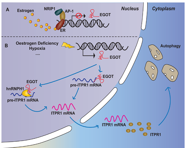 如何提高乳腺癌细胞对紫杉醇化疗敏感性是肿瘤化学药物治疗的关键突破方向。庞达教授研究团队针对这一乳腺癌治疗的瓶颈问题,2014年率先开展全转录组测序,筛选并锁定长链非编码RNA EGOT作为研究靶标。通过多维度数据分析,推测它可能增加乳腺癌细胞对紫杉醇的敏感性,该团队经过近五年的努力,首次揭示它在该领域的分子机制:雌激素通过ER-NRIP1-AP1三元复合体,转录抑制EGOT的表达。EGOT在细胞核招募HNRNPH1蛋白,后者通过互补配对和增加ITR1的稳定性双重机制,促进ITPR1的选择性剪切,增加ITPR1的表达,进一步增加肿瘤细胞自噬水平并提高对紫杉醇的敏感性。
