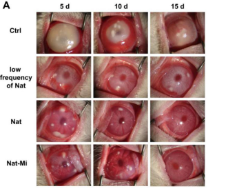 真菌性角膜炎是一种由致病真菌引起的致盲率极高的眼部感染性疾病。若感染早期未及时诊断和治疗,炎症则会迅速进展,引起角膜混浊、溃疡、穿孔,不仅会导致严重的眼内炎,还会导致颅内感染扩散。那他霉素是唯一一个被美国食品药品监督管理局批准用于控制真菌性角膜炎的滴眼液,具有抗菌谱广、抗菌能力强、不良反应少等优点。但是那他霉素难溶于水,目前市面上只有5%的那他霉素悬浊液(那特真)存在。那特真价格昂贵,除此之外,由于泪液冲刷、眼表屏障的存在,那他霉素生物利用度较低。为了提高其生物利用度,临床上常常增加用药频率(初始时每1-2小时滴1次,3-4天后改为每天6-8次,持续14-21天左右)。但是如此高的用药频率,导致患者依从性较差,最终治疗效果亦随之变差。为此人们使用各种方法通过改变药物的结构或利用载体的优良特性包载药物等方法来解决问题。