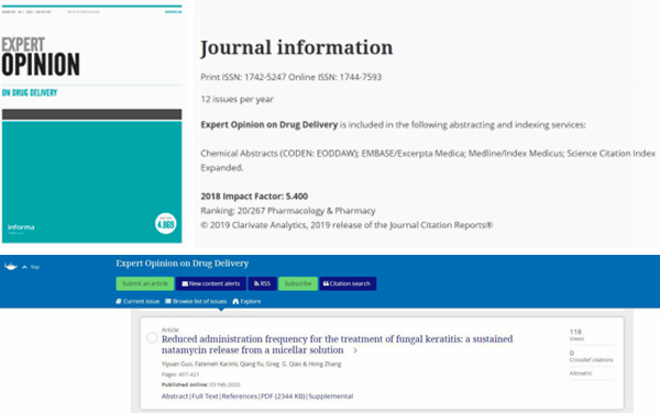 针对这一问题,哈尔滨医科大学附属第一医院张弘教授课题组和澳大利亚墨尔本大学工程学教授开展合作,合成出那他霉素载药胶束(Nat-Mi, natamycin-loaded micelles)滴眼液,2020年2月文章发表在医学2区的Expert Opinion on Drug Delivery杂志(IF=5.4)上。文章的第一作者是张弘教授的博士生郭译远,他也曾赴墨尔本大学留学。那他霉素载药胶束以其合成方法简单、安全无毒、稳定性强、载药量高、抗菌效果好等优点,弥补了那他霉素滴眼液在临床应用方面的不足,展示出广泛的临床应用前景。
