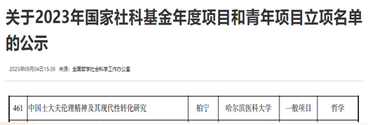近期,全国哲学社会科学工作办公室公布2023年度国家社科基金立项名单,我校马克思主义学院柏宁教授主持的《中国士大夫伦理精神及其现代性转化研究》获批立项,资助经费20万元。这一成绩实现了马克思主义学院建院以来在国家社科基金立项上的历史性突破。
