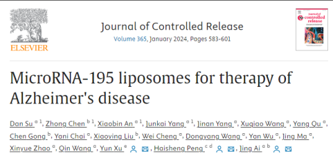 近日,我校药学院艾静教授团队在治疗阿尔茨海默病药物研究取得新突破,研究成果论文《MicroRNA-195 liposomes for therapy of Alzheimer's disease》发表于高水平期刊《Journal of Controlled Release》(2022年IF:10.8)。