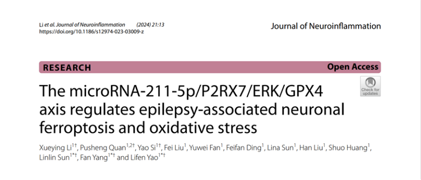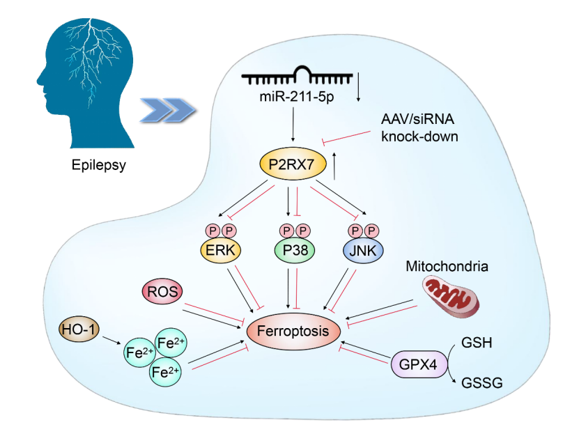 姚丽芬教授团队发现结合癫痫小鼠海马组织转录组测序数据及临床癫痫病人血液样本分析,发现P2RX7在癫痫中表达显著高于对照组,并通过一系列的体内体外实验首次证实了在癫痫模型中敲低P2RX7后可能通过MAPK/ERK通路调控GPX4/HO-1轴。在该研究中,团队同样首次证实了microRNA-211-5p在癫痫患者血液样本和海人酸诱导的癫痫小鼠海马组织中表达降低,首次证实了microRNA-211-5p和P2RX7之间存在直接相互作用关系,首次证实了microRNA-211-5p靶向P2RX7通过调控铁死亡影响癫痫。本研究从microRNA-211-5p/P2RX7轴入手阐释了铁死亡和癫痫之间可能存在的分子机制,或可在不久的将来为铁死亡相关药物靶点的设计提供理论依据。