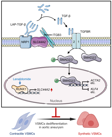 该研究通过联合分析多个主动脉瘤数据库,进一步结合主动脉瘤临床样本和动物模型,发现病理条件下平滑肌细胞中SLC44A2的表达水平明显升高;并且在动物和细胞水平证明SLC44A2在疾病过程中发挥代偿性保护作用;机制研究发现SLC44A2可介导NRP1和ITGB3的结合从而激活TGF-β/SMAD信号通路,维持平滑肌细胞收缩表型。同时,该研究发现SLC44A2表达受转录因子RUNX1调控,药物来那度胺可通过RUNX1促进SLC44A2表达,减轻血管平滑肌细胞表型转化,从而改善主动脉瘤。