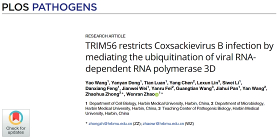 哈尔滨医科大学基础医学院赵文然教授与钟照华教授团队研究发现,细胞的E3泛素连接酶TRIM56是柯萨奇病毒B(CVB)感染的内在限制因子。TRIM56通过介导病毒RNA依赖的RNA聚合酶3D的泛素化抑制病毒复制,这一发现揭示了泛素蛋白酶体系统在对抗病毒感染中的作用,为控制CVB感染提供了潜在策略。2024年9月30日,该研究论文《TRIM56 restricts Coxsackievirus B infection by mediating the ubiquitination of viral RNA-dependent RNA polymerase 3D》发表在病毒学领域权威期刊PLOS Pathogens。