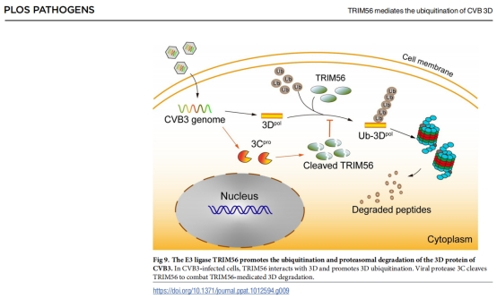 本研究首先揭示了CVB3 RNA聚合酶3D蛋白的泛素化修饰。为了确定CVB3 3D蛋白的泛素化修饰情况及其与其他分子的相互作用,研究人员通过蛋白质组学分析、pull - down、免疫沉淀分析以及免疫荧光观察等实验,确定3D蛋白的K220位点发生了K48多聚泛素化修饰,这一修饰的结果导致3D蛋白的降解。其次,CVB3感染时,TRIM56表达上调且与病毒3D蛋白相互作用、共定位,过表达TRIM56促进3D蛋白的泛素化,同时抑制病毒复制。此外,该团队发现病毒的3C蛋白酶可剪切TRIM56,从而阻止病毒3D蛋白的降解,即病毒通过此方式逃避宿主对病毒复制的限制。这些研究结果进一步阐明了CVB3与宿主细胞之间复杂的相互作用关系,为深入理解病毒感染机制和研究有效的抗病毒治疗方法提供了重要依据。