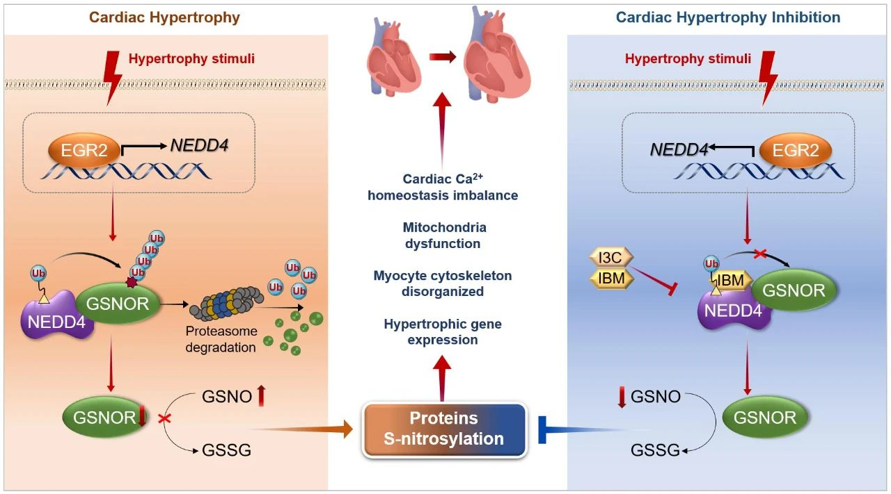季勇教授团队首次揭示了E3泛素酶NEDD4介导GSNOR的泛素化-蛋白酶体降解,导致其表达降低,从而加重心肌肥厚。同时,团队针对这一关键靶标,发现了两种NEDD4活性抑制剂(IBM、I3C)能通过阻断GSNOR泛素化缓解心肌肥厚。该研究揭示了心肌肥厚等相关心血管疾病发病新机制,为相关疾病的防治提供了新的理论依据和潜在治疗策略。
