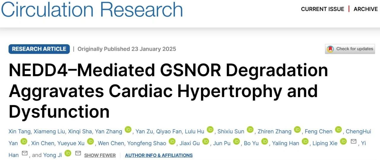 1月23日,我校寒地心血管病全国重点实验室季勇教授团队首次揭示了NEDD4介导GSNOR降解促进心肌肥厚及NEDD4活性抑制剂对心肌肥厚具有潜在保护作用。研究论文《NEDD4-mediated GSNOR degradation aggravates cardiac hypertrophy and dysfunction》发表在《Circulation Research》。