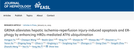 近日,哈尔滨医科大学附属第一医院麻勇教授团队在国际权威肝病学期刊《Journal of Hepatology》(IF:26.8)在线发表了题为“GRINA alleviates hepatic ischemia‒reperfusion injury-induced apoptosis and ER-phagy by enhancing HRD1-mediated ATF6 ubiquitination”的研究论文。