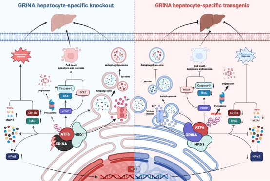麻勇教授团队首次揭示,内质网钙稳态调节蛋白GRINA在肝脏缺血再灌注后表达异常,其水平与肝损伤严重程度呈负相关。机制研究发现,GRINA主要通过与E3泛素连接酶HRD1及内质网应激关键因子ATF6直接互作,促进ATF6的多泛素化降解,从而降低内质网应激及自噬的过度激活,维持细胞内钙稳态。本研究揭示了肝脏缺血再灌注损伤发病新机制,为评估肝移植及肝切除术后肝损伤提供了新的理论依据和潜在干预策略。