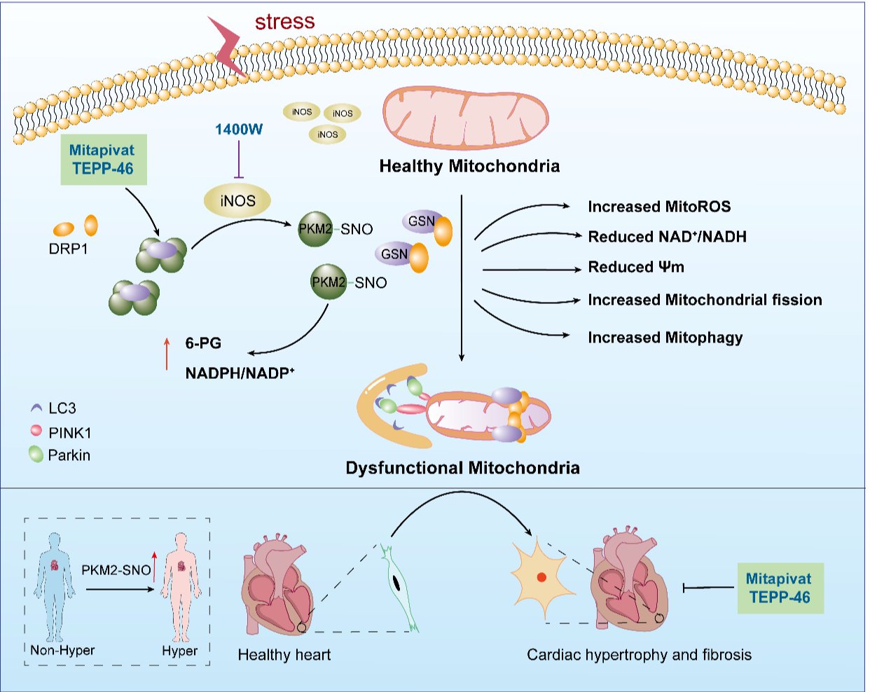2025年12月,哈尔滨医科大学及南京医科大学季勇教授、谢利平教授和韩艺教授在Circulation发表了题为“S-Nitrosylation of Pyruvate Kinase Isoform 2 Drives Cardiac Fibrosis by Promoting Mitochondrial Fission”的文章。系统分析了SNO-PKM2在心肌细胞和心肌成纤维细胞的表达情况,揭示了其通过诱导代谢重编程和线粒体分裂,促进心肌成纤维细胞活化,并最终导致心力衰竭的分子机制。更重要的是,基于该机制,发现了目前治疗溶血性贫血的药物Mitapivat在抑制心肌成纤维细胞活化,延缓心功能恶化和心衰中的临床新作用,为心力衰竭的防治提供了潜在干预策略。